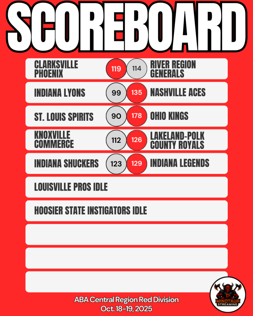 However, we have a ton of contacts within the ABA Central Region Red Division, some time on our hands, and an innate desire to keep fans informed. Over the years, we have found the ABA’s website to be inaccurate from time to time, since they’re trying to keep up with 200+ teams in the league. We’re only trying to keep up with 9 teams here.