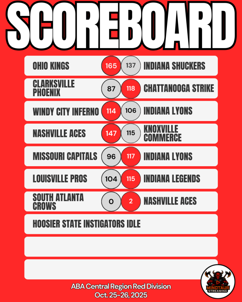 However, we have a ton of contacts within the ABA Central Region Red Division, some time on our hands, and an innate desire to keep fans informed. Over the years, we have found the ABA’s website to be inaccurate from time to time, since they’re trying to keep up with 200+ teams in the league. We’re only trying to keep up with 9 teams. These are our best efforts.