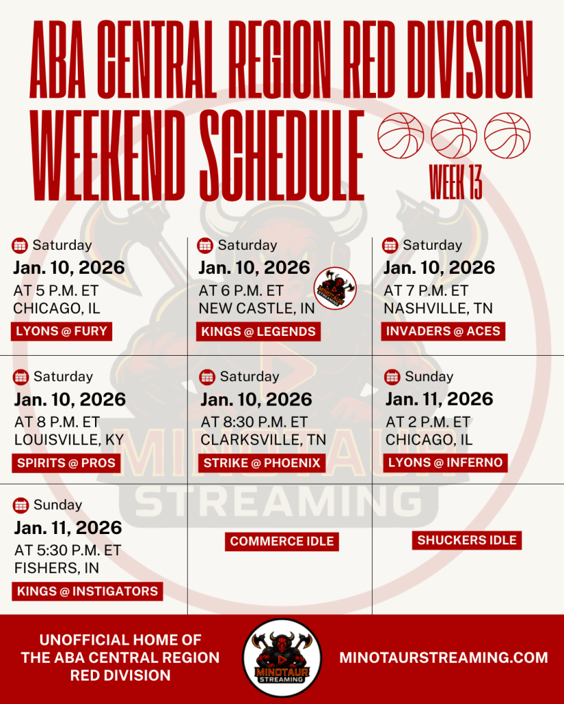 This is the unofficial schedule for Week 13 in the American Basketball Association (ABA) Central Region Red Division. Minotaur Streaming is in no way hired by, paid by, approved by, associated with, acknowledged by, related to, or in any other fashion connected to the ABA. We’re not even sure the ABA knows we exist.