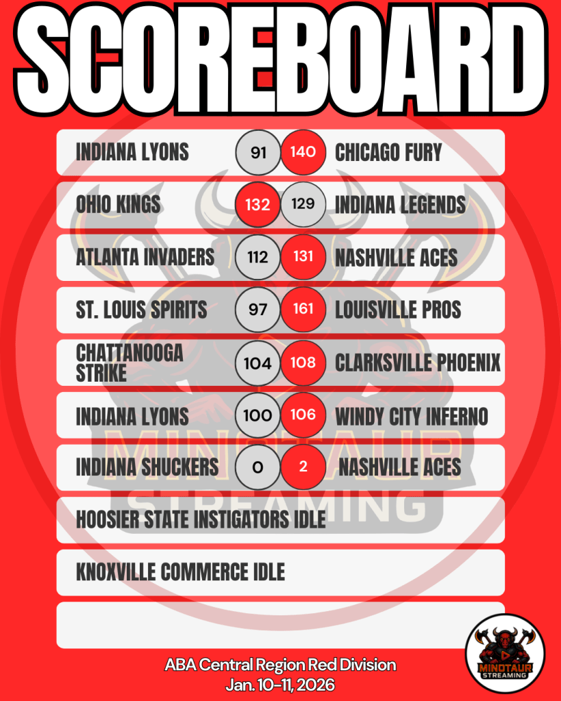 These are unofficial results from Week 13 in the American Basketball Association (ABA) Central Region Red Division. Minotaur Streaming is in no way hired by, paid by, approved by, associated with, acknowledged by, related to, or in any other fashion connected to the ABA. We’re not even sure the ABA knows we exist.
