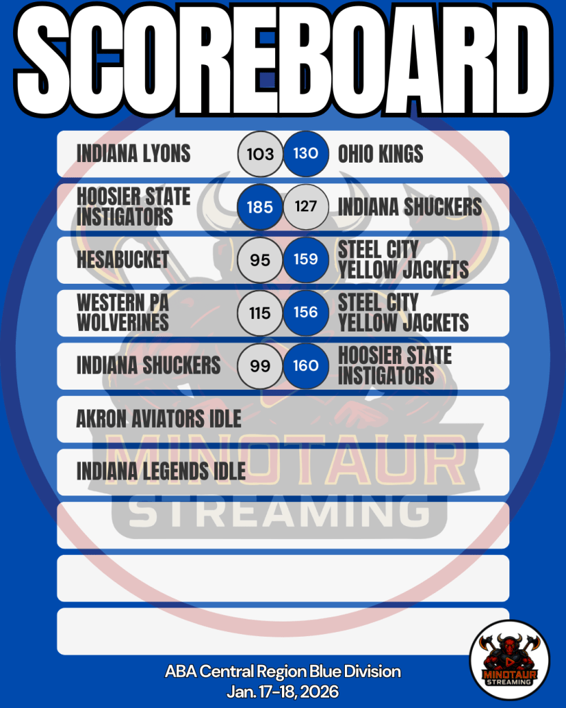 These are unofficial results from Week 14 in the American Basketball Association (ABA) Central Region Blue Division. Minotaur Streaming is in no way hired by, paid by, approved by, associated with, acknowledged by, related to, or in any other fashion connected to the ABA. We’re not even sure the ABA knows we exist.