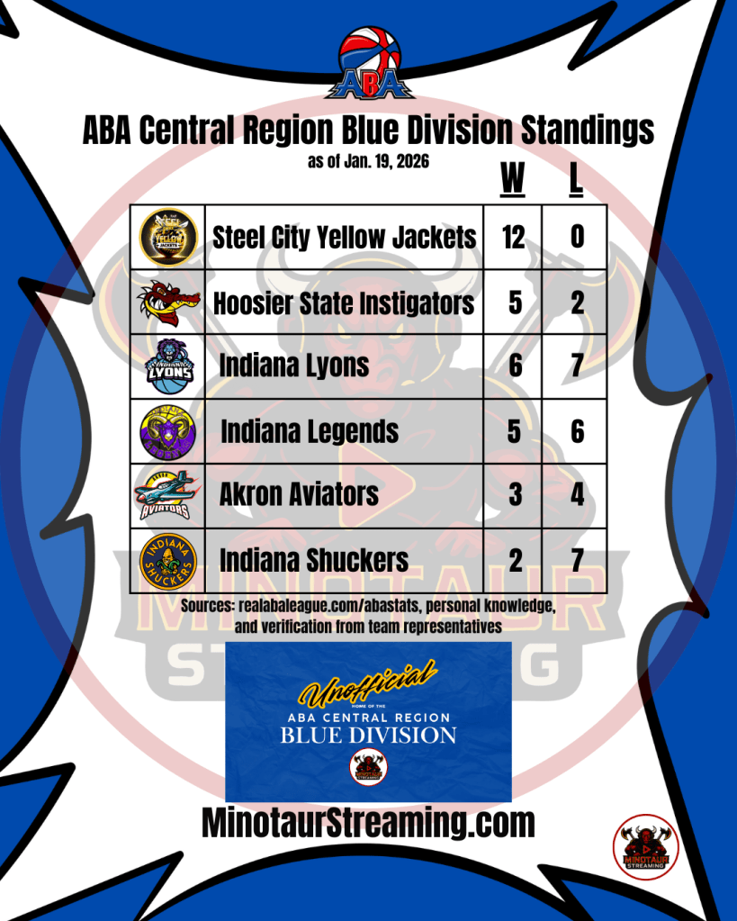 These are unofficial standings after Week 14 in the American Basketball Association (ABA) Central Region Blue Division. Minotaur Streaming is in no way hired by, paid by, approved by, associated with, acknowledged by, related to, or in any other fashion connected to the ABA. We’re not even sure the ABA knows we exist.