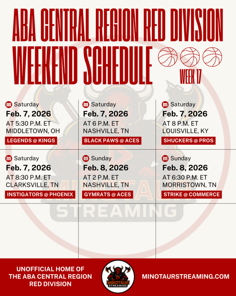 This is the unofficial schedule for Week 17 in the American Basketball Association (ABA) Central Region Red Division. Minotaur Streaming is in no way hired by, paid by, approved by, associated with, acknowledged by, related to, or in any other fashion connected to the ABA.