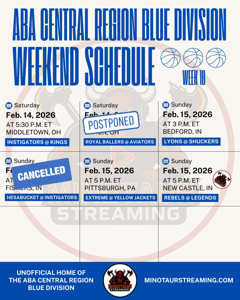 This is the unofficial schedule for Week 18 in the American Basketball Association (ABA) Central Region Blue Division. Minotaur Streaming is in no way hired by, paid by, approved by, associated with, acknowledged by, related to, or in any other fashion connected to the ABA.