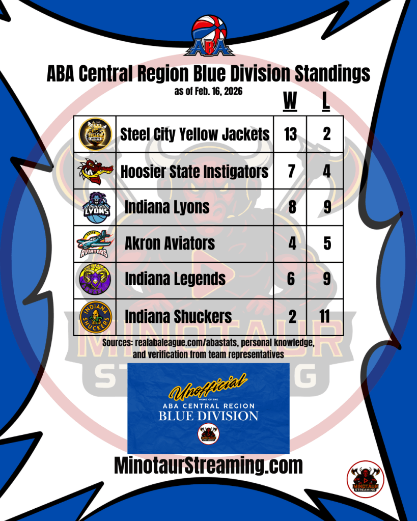 These are unofficial standings after Week 18 in the American Basketball Association (ABA) Central Region Blue Division. Minotaur Streaming is in no way hired by, paid by, approved by, associated with, acknowledged by, related to, or in any other fashion connected to the ABA.