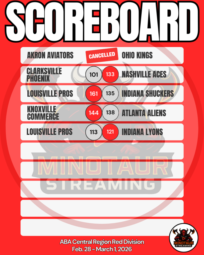 These are unofficial results from Week 20 in the American Basketball Association (ABA) Central Region Red Division. Minotaur Streaming is in no way hired by, paid by, approved by, associated with, acknowledged by, related to, or in any other fashion connected to the ABA.